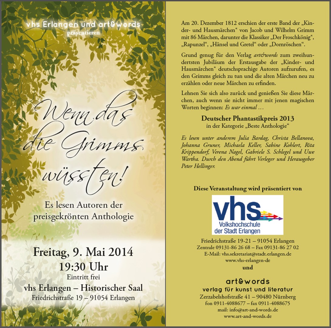 Neun Autoren der preisgekrönten art & words Märchenanthologie „Wenn das die Grimms wüssten!“ lesen in der VHS Erlangen – darunter auch ich.