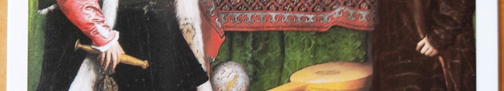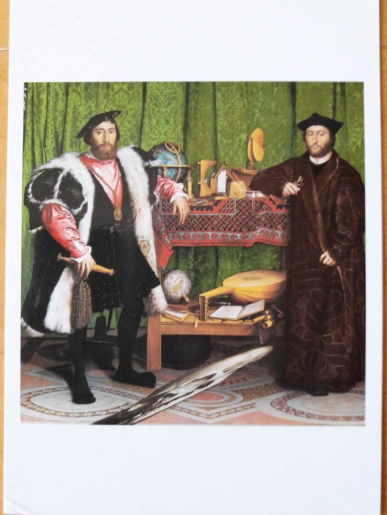 Wir nehmen heute Abschied von der National Gallery, und zwar mit „Die Gesandten“ („The Ambassadors“) von Hans Holbein dem Jüngeren (1497/8-1543), einem der bedeutendsten Portraitmaler der Renaissance. „Die Gesandten“ entstand 1533 in London. Das Gemälde ist ausdrucksstark, detailreich und detailtreu. Der Clou dieses Werks befindet sich auf dem Boden, zwischen den Füßen der beiden Männer. Man muss ganz nah an das Bild heran treten, an den rechten Rand, und es aus flachem Winkel betrachten, dann erkennt man die Anamorphose: einen Totenschädel.
