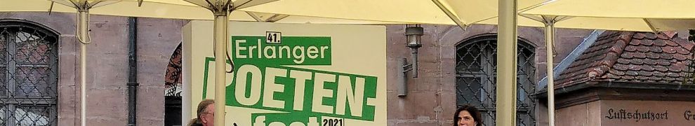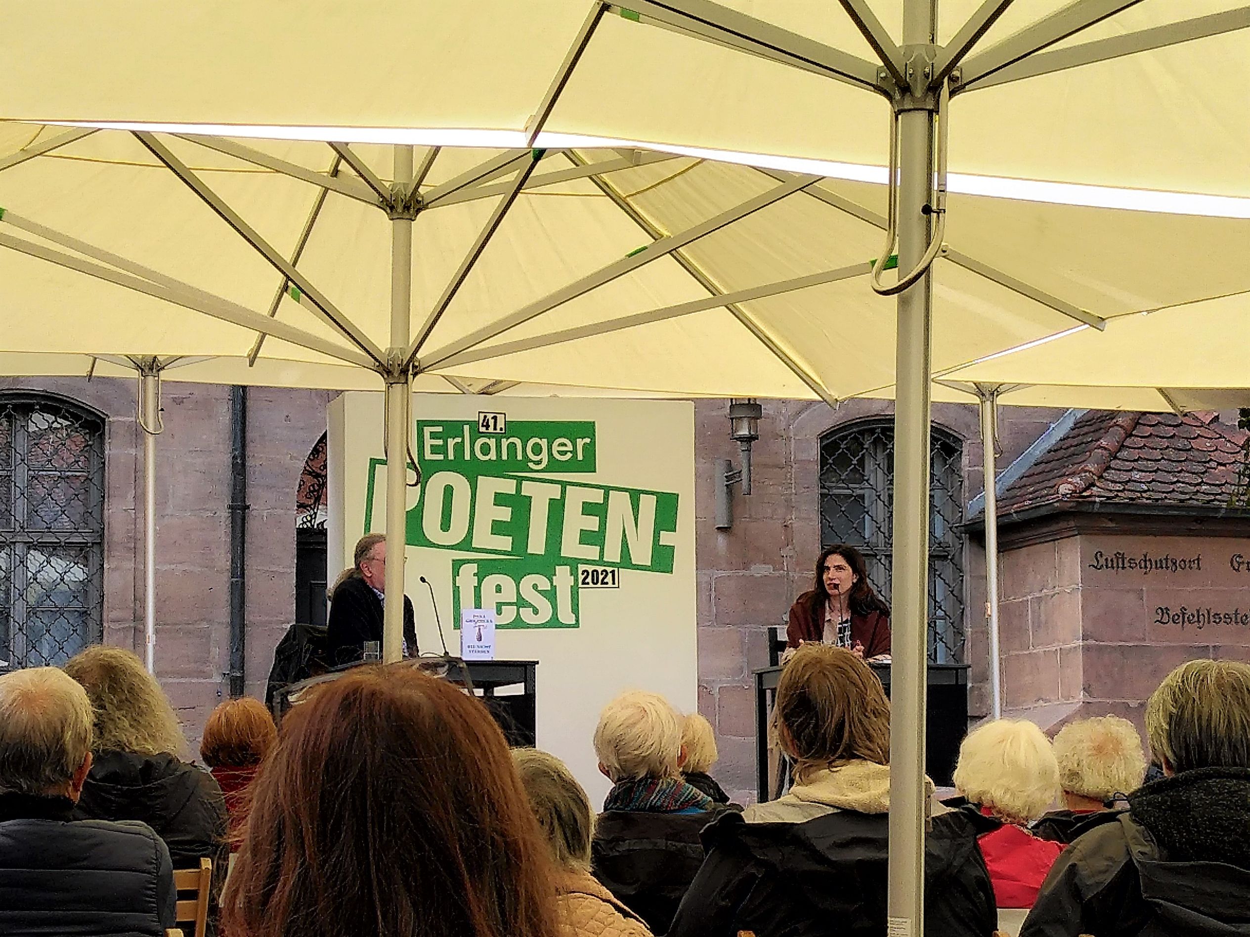 Mein Erlanger Poetenfest 2021 begann letzte Woche Samstagnachmittag im Innenhof des Stadtmuseums. Ich saß auf meinem reservierten Platz, die nahe Kirchturmuhr schlug 2 Uhr und die Sonne kam hinter den Wolken hervor. Ein wohliges Glücksgefühl durchströmte mich und da betraten Dana Grigorcea und Dirk Kruse auch schon gut gelaunt die Bühne.