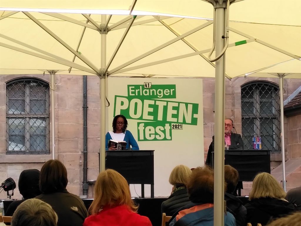 Sharon Dodua Otoo wurde 1972 in London geboren, studierte unter anderem Deutsch, lebt seit langem mit ihrer Familie in Berlin und schreibt auch auf Deutsch. Sie gehört zum illustren Kreis der Autorinnen, die den Bachmannpreis nicht nur gewonnen, sondern ihren Siegertext auch beim Erlanger Poetenfest präsentiert haben (2016, „Herr Gröttrup setzt sich hin“).