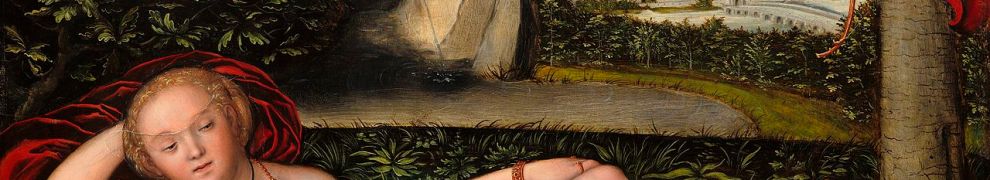 Ebenso wie Diana ist die „Ruhende Quellnymphe“ von Lucas Cranach d.Ä. eine Jägerin. Köcher und Bogen hat sie an einen Ast gehängt und scheint nach den Strapazen der Jagd zu rasten. Neben der offenkundigen Nacktheit der Figur, die durch den durchsichtigen Schleier und die Goldkette noch betont wird, kann auch die Quelle, die einer grottenartigen Höhle entspringt, als Symbol der weiblichen Sexualität gedeutet werden. Gleichzeitig sagt uns die Inschrift links oben, dass es sich um die Nymphe einer heiligen Quelle handelt, deren Ruhe wir nicht stören sollen. Die Botschaft könnte also lauten: Wir sollen uns der Liebe und Sexualität mit feinfühliger Ehrfurcht nähern.