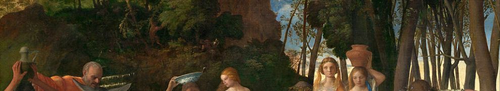 Beim Festmahl der Götter (um 1514) von Giovanni Bellini treffen wir zwei Figuren der letzten Woche wieder: Im Kreis weiterer Gottheiten, in einer grünen Waldszenerie, bedient von Nymphen und Satyrn, sehen wir Jupiter, gekennzeichnet durch sein Attribut, den Adler, und links neben ihm Merkur mit dem Heroldsstab, Reisehut und Flügelschuhen. Bellini (ca. 1430-1516) erhielt den Auftrag für das Gemälde, als er schon über 80 war. Er reagierte bis ins Alter auf Neuerungen in der Malerei, angeregt beispielsweise von jüngeren Künstlern wie Giorgione und Tizian, und blieb so bis zuletzt auf der Höhe der Zeit.