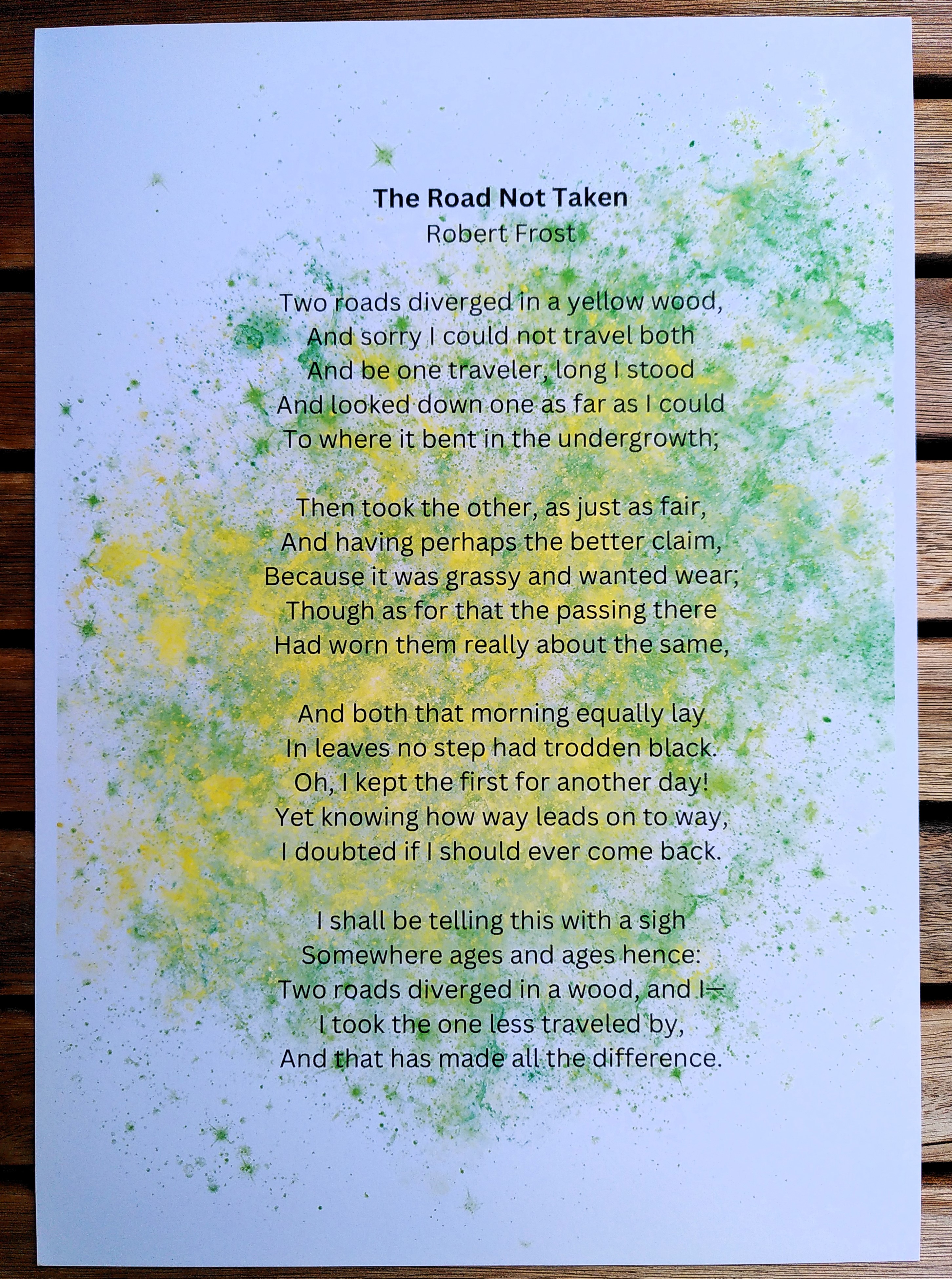 Robert Frosts „The Road Not Taken“ gehört zu den populärsten Gedichten im englischen Sprachraum und lässt viel Raum für Interpretation (siehe z.B. Wikipedia, The Paris Review, Modern American Poetry Site). Für mich drücken Frosts Zeilen aus, dass jede Entscheidung für etwas auch eine Entscheidung gegen etwas bedeutet – es kann gar nicht anders sein. Deswegen ist es wenig sinnvoll, zu viel über Entscheidungen zu grübeln – vor allem nicht über bereits getroffene. Keine Angst vor ungelebtem Leben!