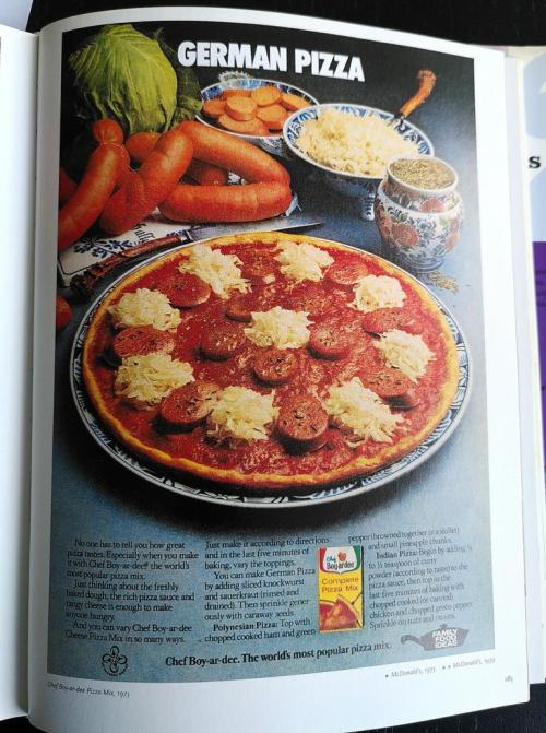 Jedoch enthält das Buch auch Hinweise, dass die Amerikaner schon damals merkwürdige Auffassungen von gutem Geschmack hatten… beispielsweise German Pizza mit Knackwurst und Sauerkraut.